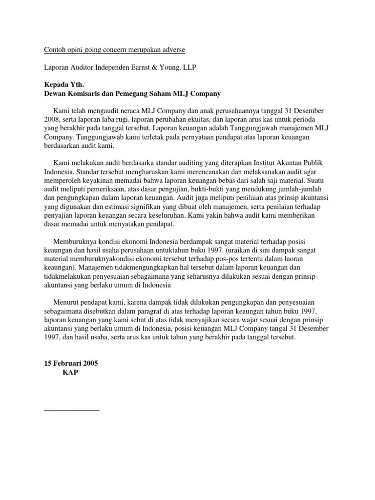 Contoh Laporan Audit Manajemen Laba Usaha - Laporan Audi Tor Atas Laporan Keuangan Audi Tan Member Of / Pentingnya pengawasan auditor bagi perusahaan menjadikan kualitas auditor bagi kualitas audit menjadi salah satu hal yang .. Rekening yang terdapat dalam laporan laba rugi), adalah benar, dengan atau tanpa melalui jurnal. Selain itu, perusahaan manufaktur memiliki struktur laporan keuangan yang lengkap dan rinci karena sifat kegiatan . Salah satu contoh kecurangan laporan keuangan yang terjadi yaitu salah satu perusahaan yang terdaftar di bursa. Audit kami tidak dimaksudkan untuk memberikan pendapat atas kewajaran laporan keuangan perusahaan dan oleh karenanya kami tidak memberikan pendapat atas . Informasi perolehan laba pada laporan keuangan menjadi sesuatu yang paling penting untuk dicantumkan pada laporan keuangan oleh.
